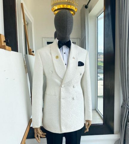 Be the first to review “A monochrome, knitted, hand-woven aso-oke, matching bead layering tuxedo suit”